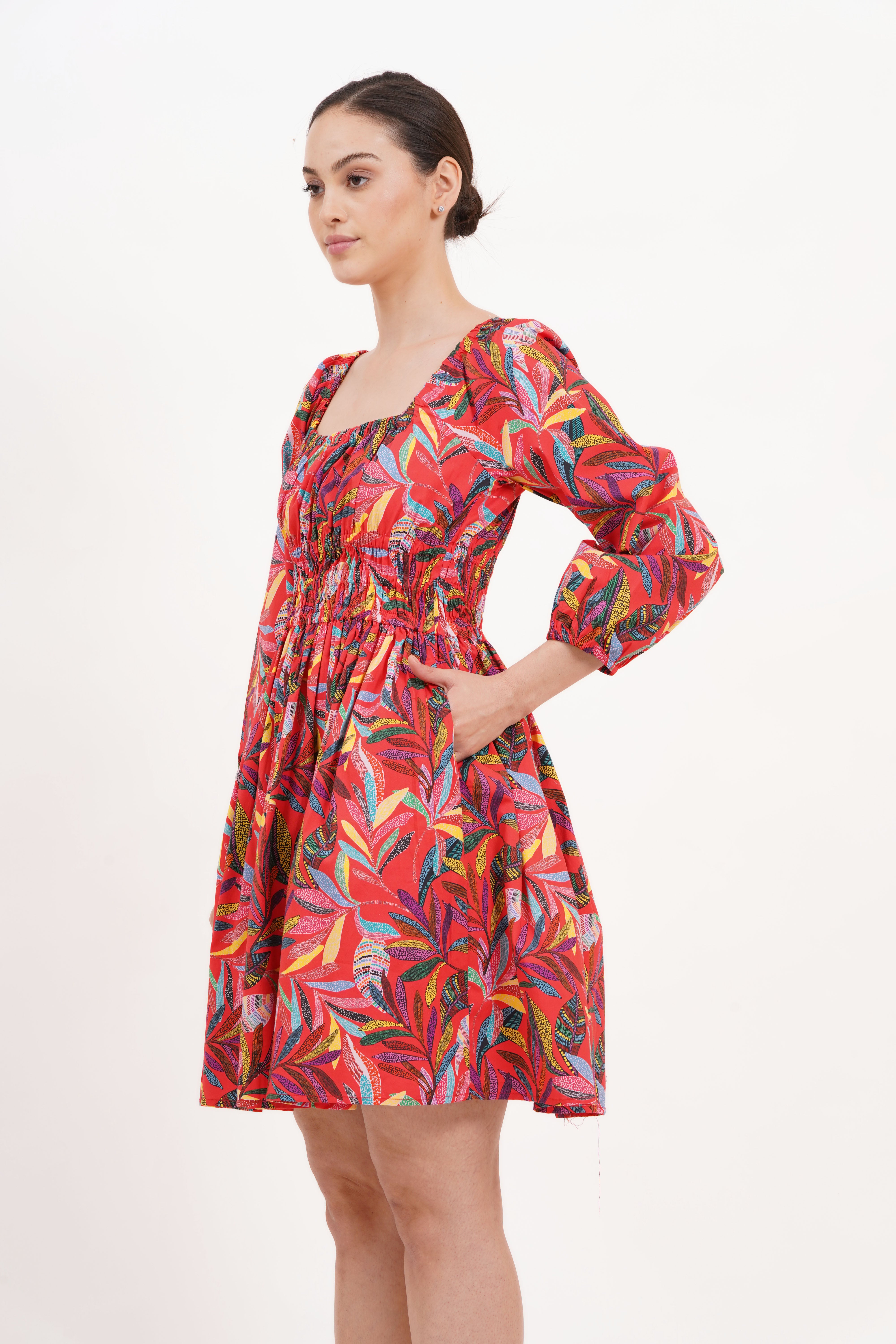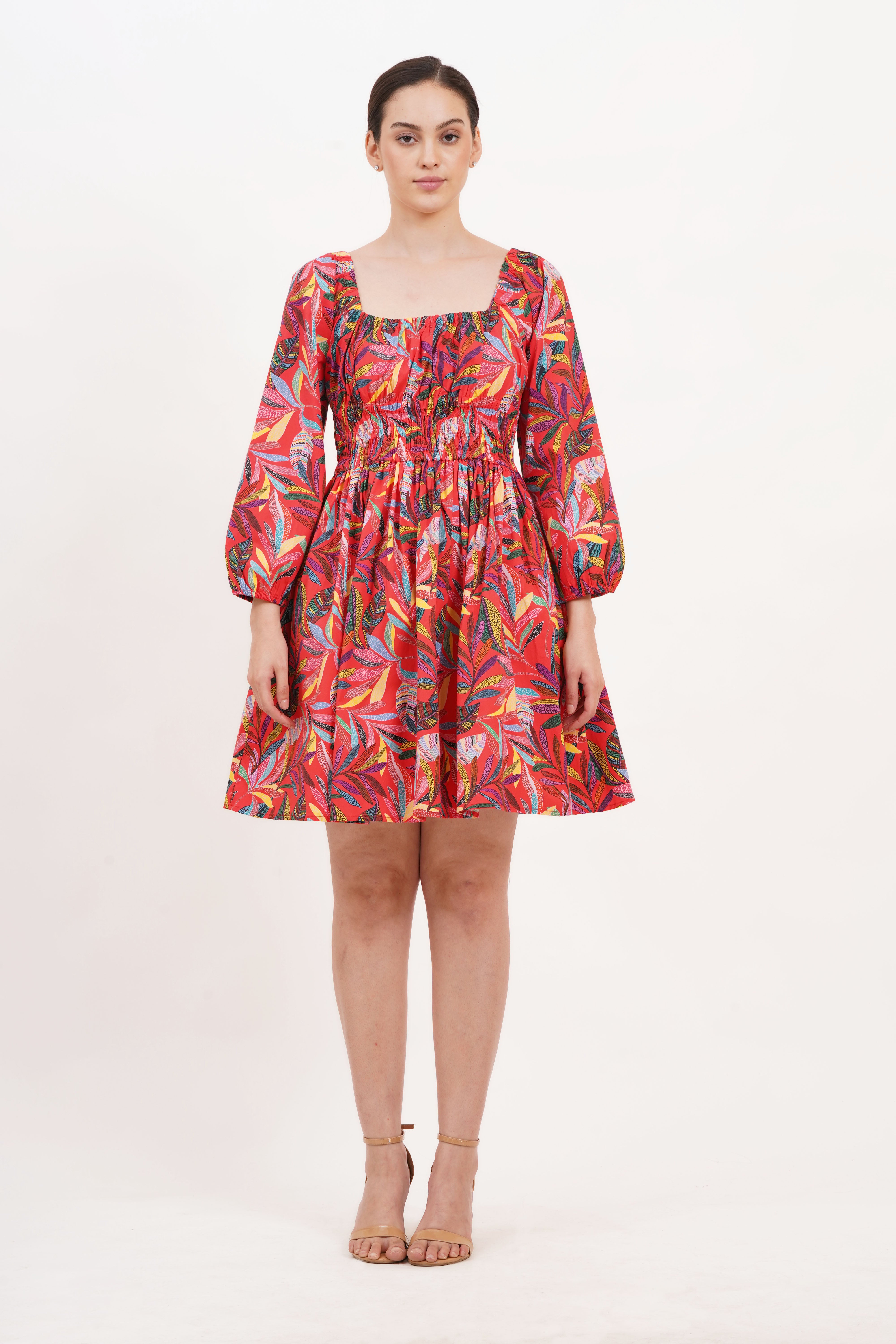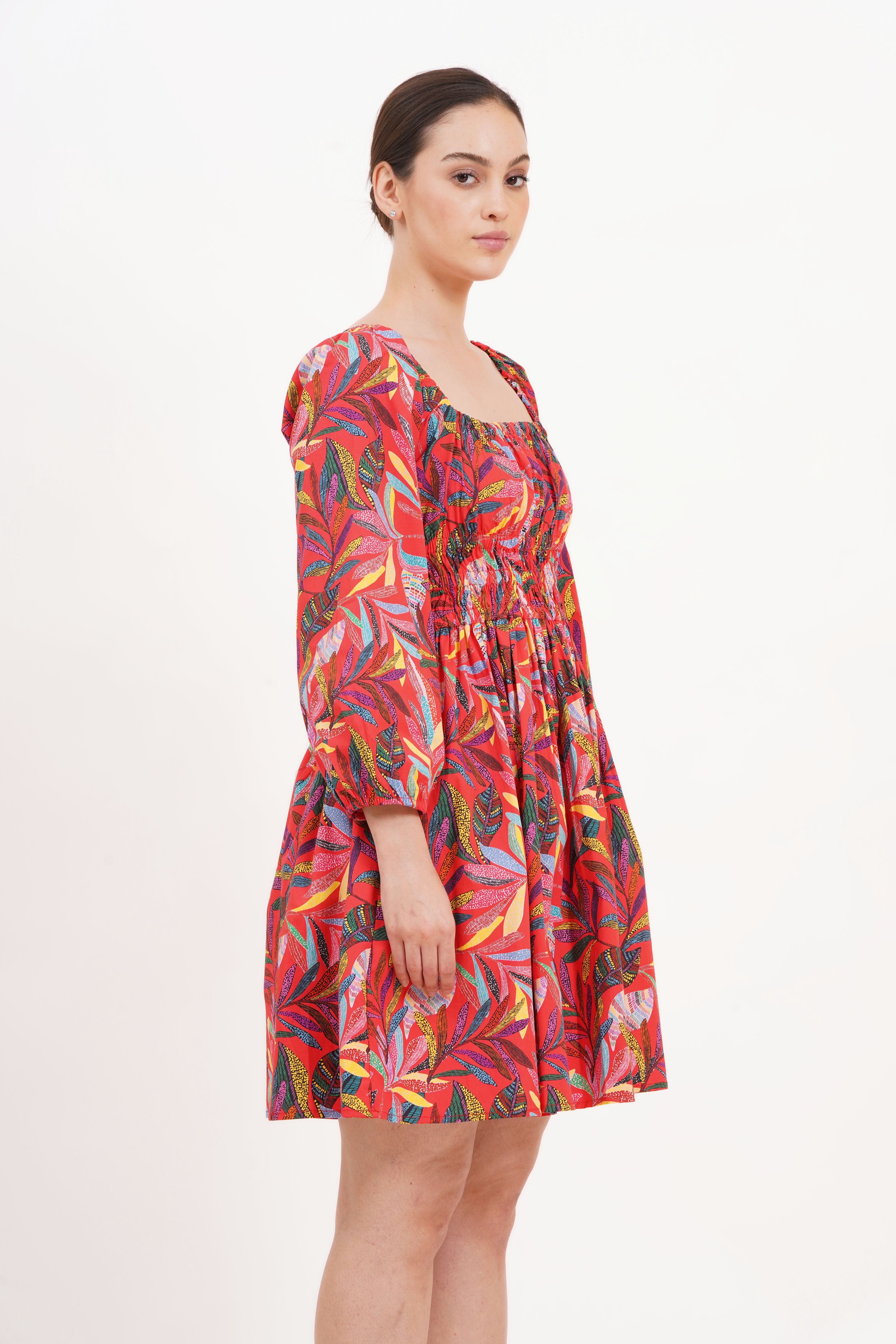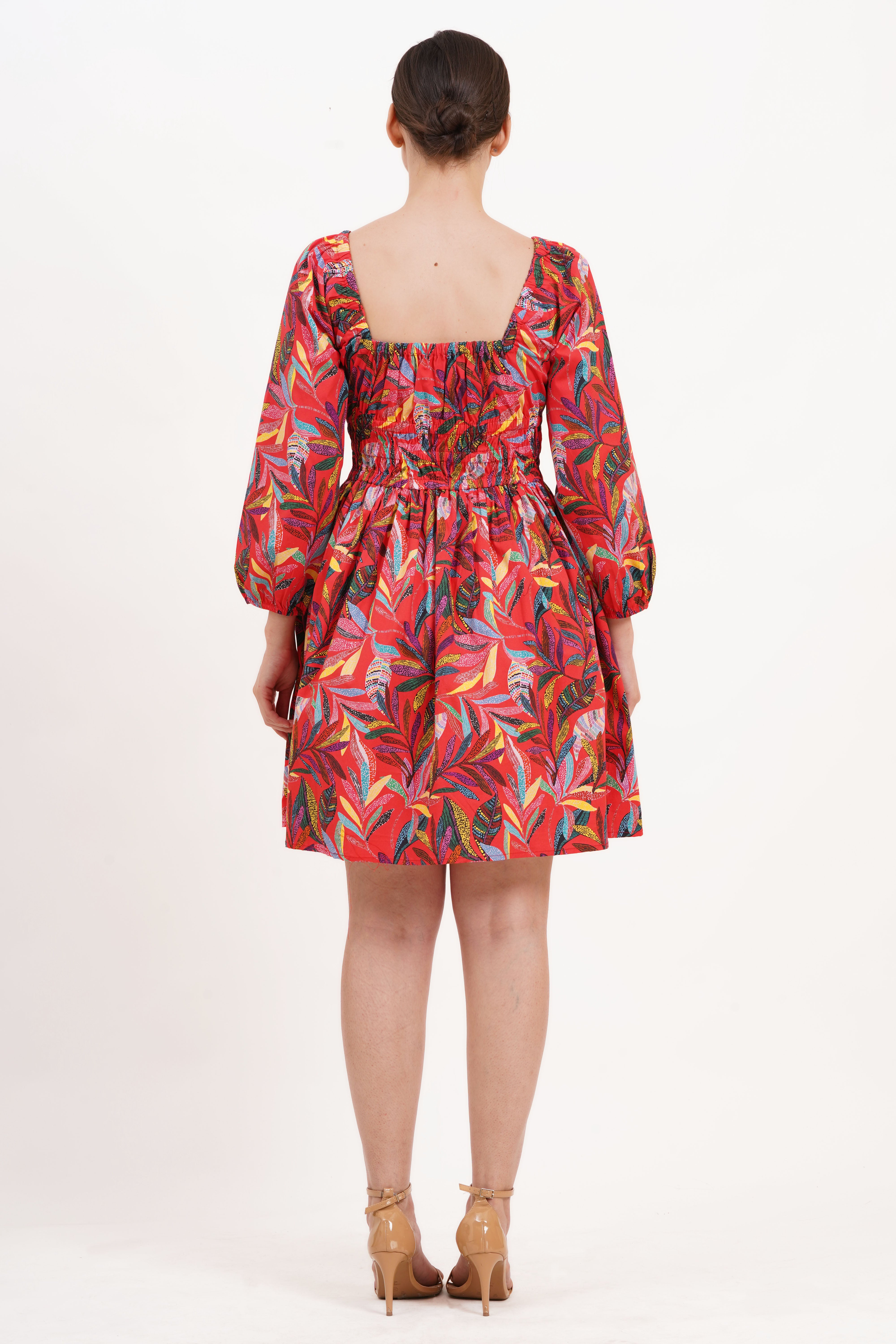 Genevieve Square Neck Mini Dress Palm Foliage Poppy Red