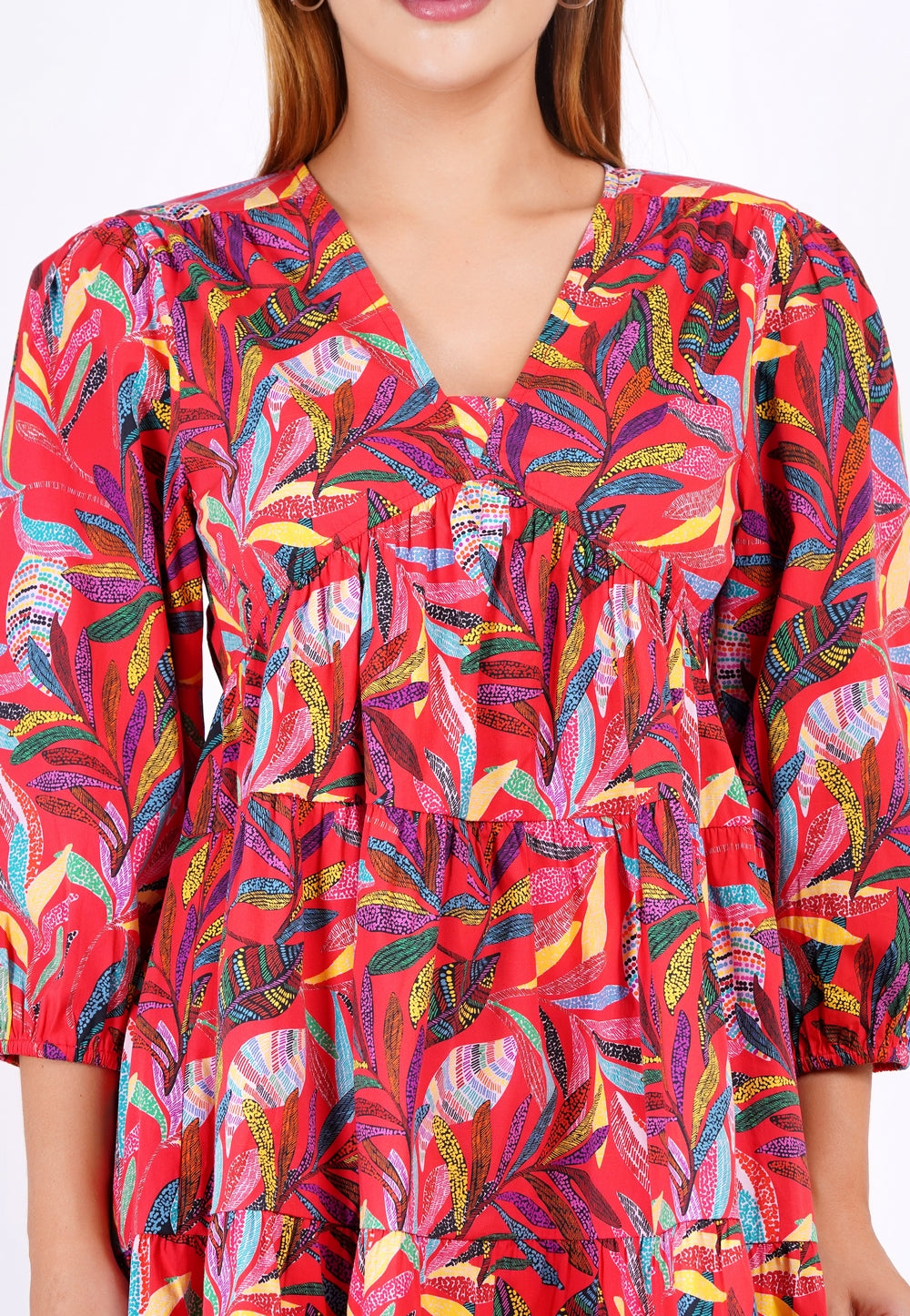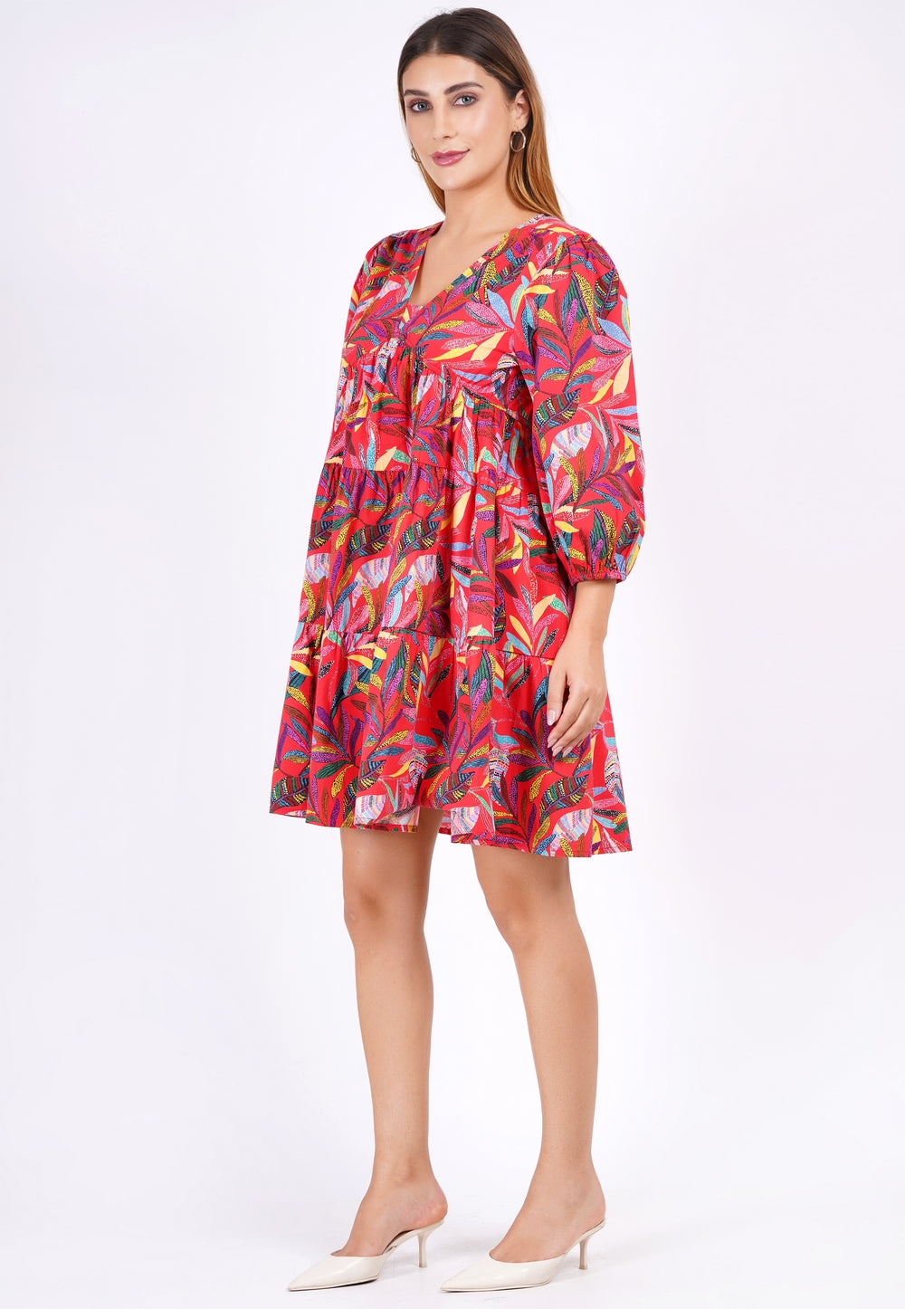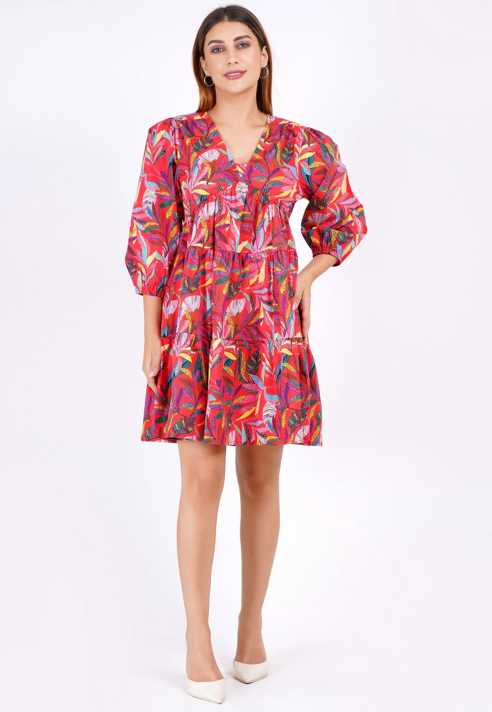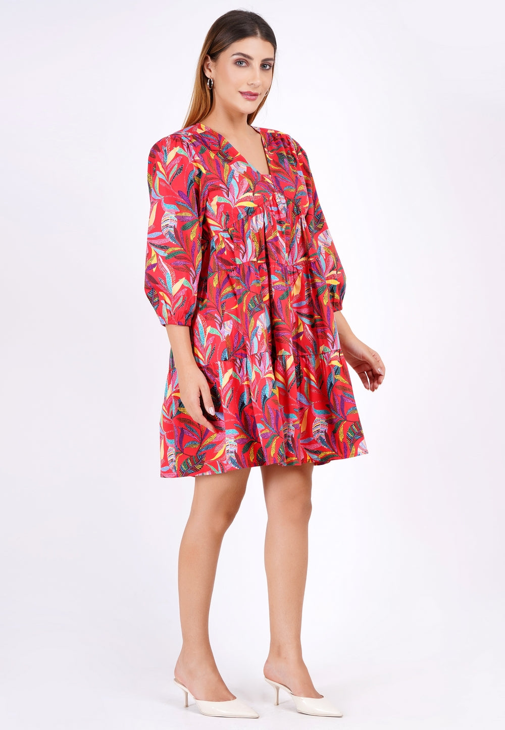 Zariah Empire Waist Mini Dress Palm Foliage Poppy Red