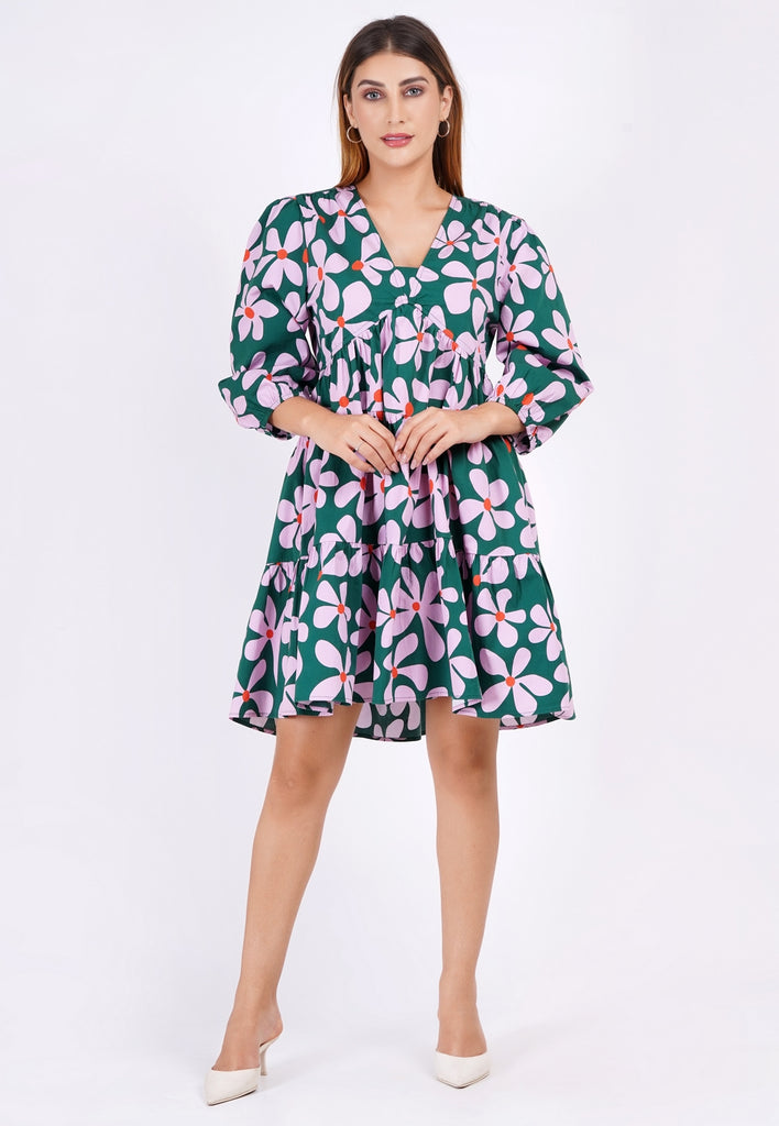 Zariah Empire Waist Mini Dress Dancing Daisies Evergreen