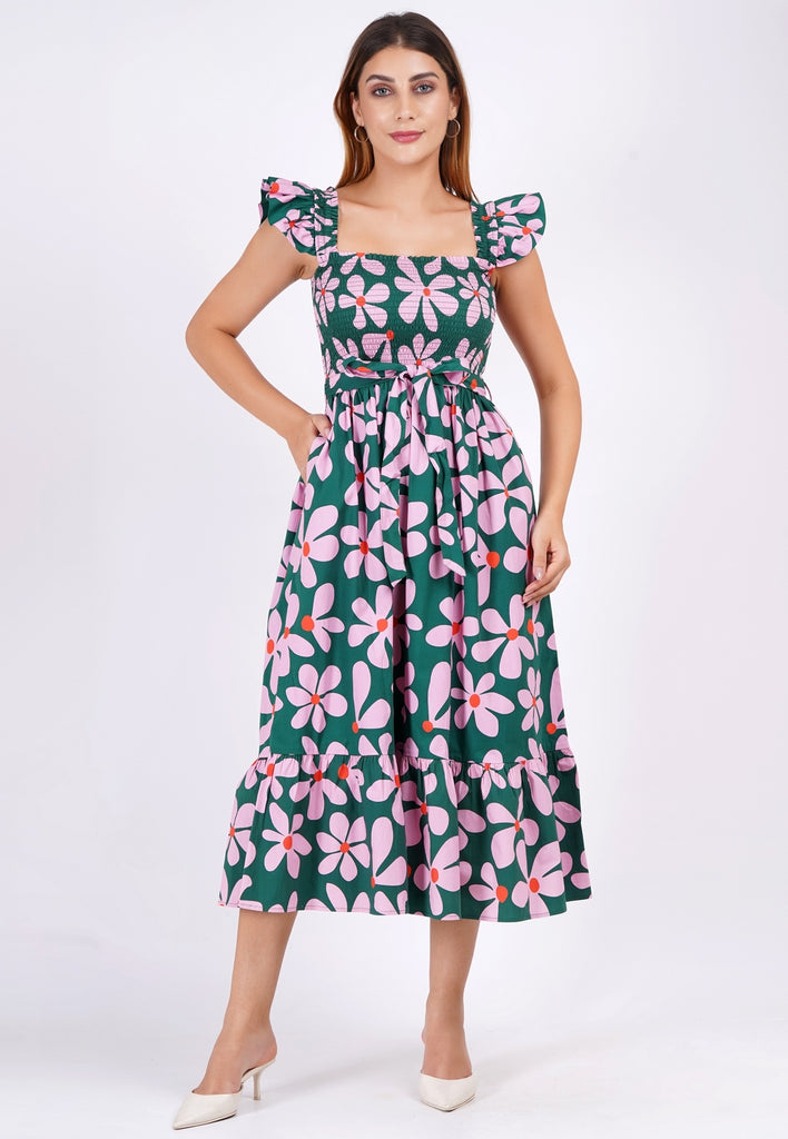 Ivanna A-Line Smocked Midi Dress Dancing Daisies Evergreen