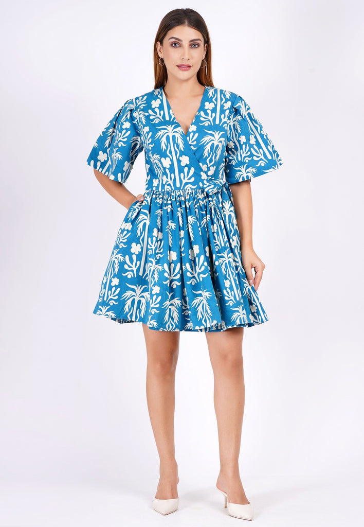 Alena Mini Wrap Dress Palm Fields Mykonos Blue