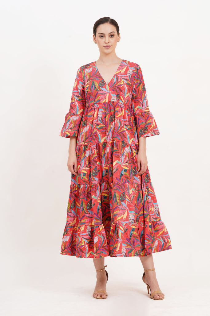 Sariah Poplin Maxi Dress Palm Foliage Poppy Red